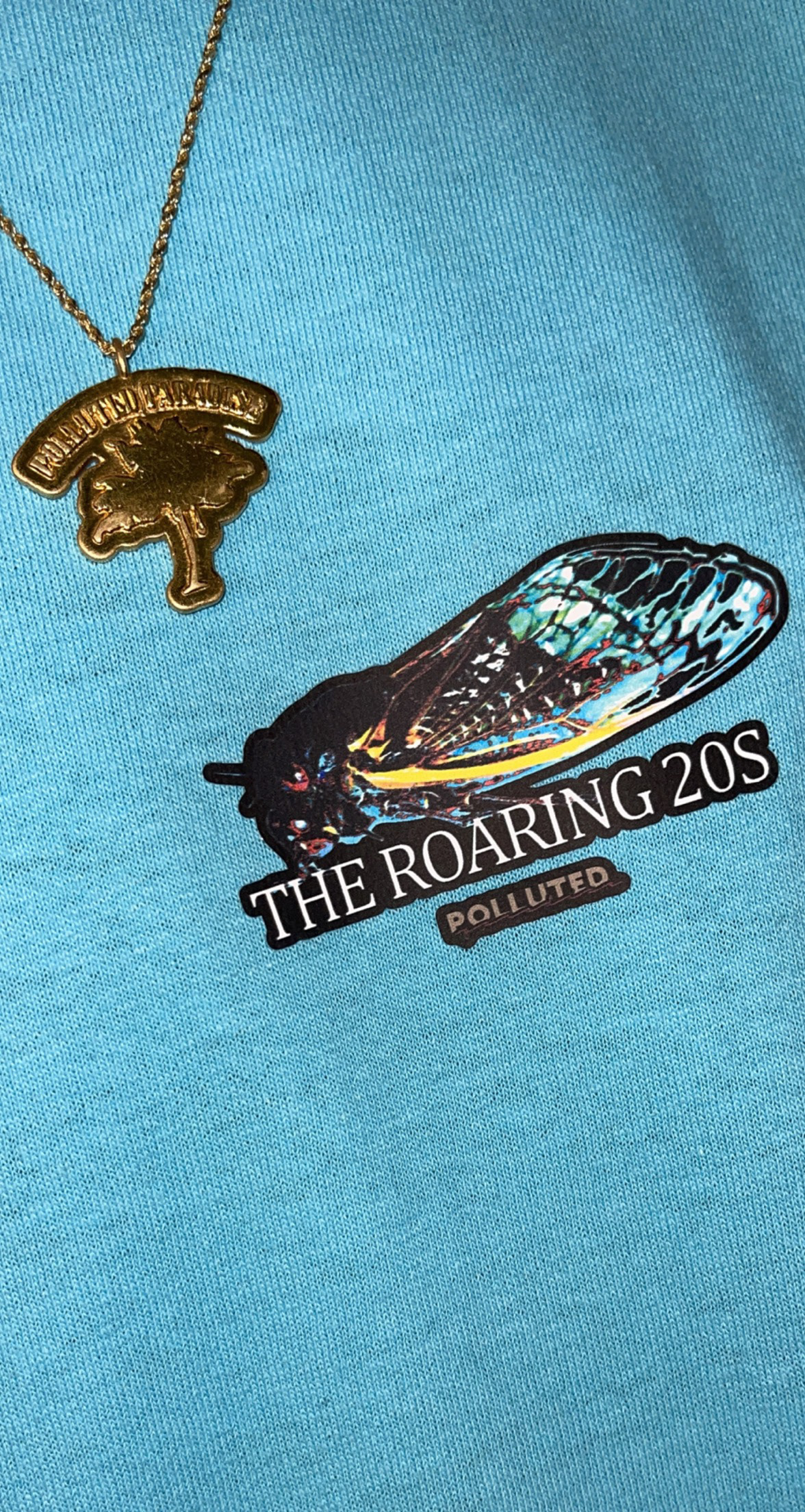 The Roaring 20’s pieces were inspired by and feature the incredibly loud cicadas from 2020 that only come out of the ground every 19 years . Additionally, the design on the back glows in the dark uses the wings to spell the spell the brand name.
